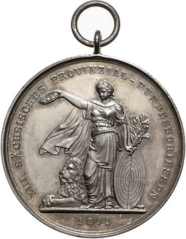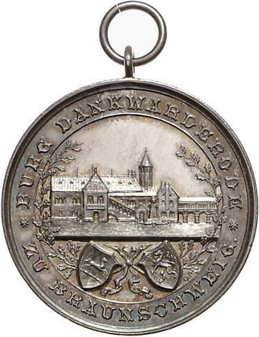 Los-Nummer: Auktion 51 - 676 Altdeutsche Münzen und Medaillen Braunschweig-Braunschweig, Stadt Tragbare Medaille 1892, signiert O.P. Auf das 13. sächsische Provinzial-Bundesschießen. Stadtgöttin mit Schießscheibe neben liegendem Löwen / Ansicht der Burg Dankwarderode. Slg. Peltzer vergl. 918. 37,5 mm, 25,84 g. Originalöse. Winz. Kratzer, vorzüglich - Stempelglanz Schätzpreis: 125,- Zuschlag: 110,- |