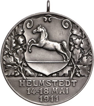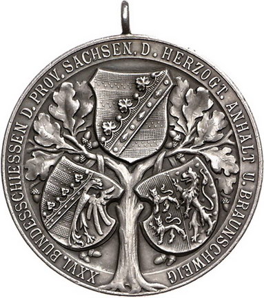 Los-Nummer: Auktion 51 - 906 Altdeutsche Münzen und Medaillen Helmstedt, Stadt Tragbare Medaille 1911, von Oertel. Auf das 26. Bundesschießen der Provinz Sachsen, der Herzogtümer Anhalt und von Braunschweig. Wappen auf Eichenblättern, im Abschnitt drei Zeilen Schrift / Eiche mit den Wappen der Provinz Sachsen, des Herzogtums Anhalt und Braunschweigs. Slg. Peltzer 1302. 39 mm, 25 g. Originalöse. Mattiert. Vorzüglich Schätzpreis: 125,- Zuschlag: 280,- |