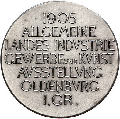 Los-Nummer: Auktion 51 - 1324 Altdeutsche Münzen und Medaillen Oldenburg Friedrich August 1900-1918, Versilberte Bronzemedaille 1905. Wie vorher. 40 mm. Winz. Randfehler, winz. Kratzer, fast vorzüglich Schätzpreis: 100,- Zuschlag: 95,- |