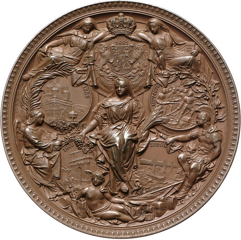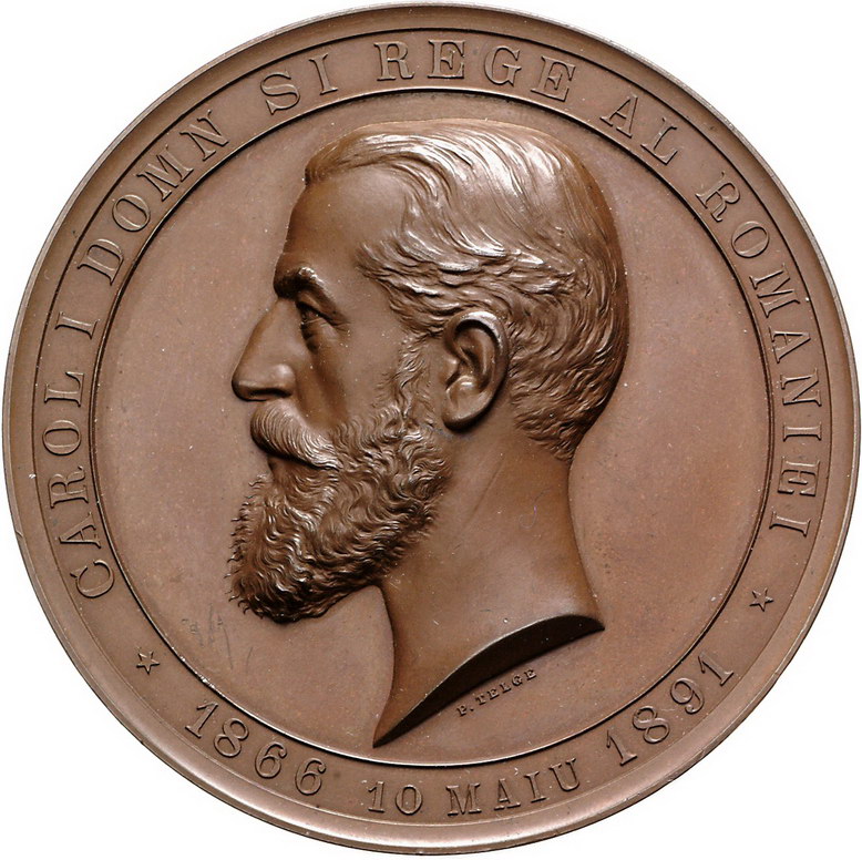 Los-Nummer: Auktion 51 - 3662 Ausländische Münzen und Medaillen Rumänien Carol I. 1866-1914, Bronzemedaille 1891, von Telge. Auf sein 25jähriges Regierungsjubiläum. Kopf nach links / Das personifizierte Rumänien umgeben von Medaillons mit Gebäudeansichten und Darstellung geschichtlicher Begebenheiten. 80 mm. Vorzüglich - Stempelglanz Schätzpreis: 350,- Zuschlag: 390,- |