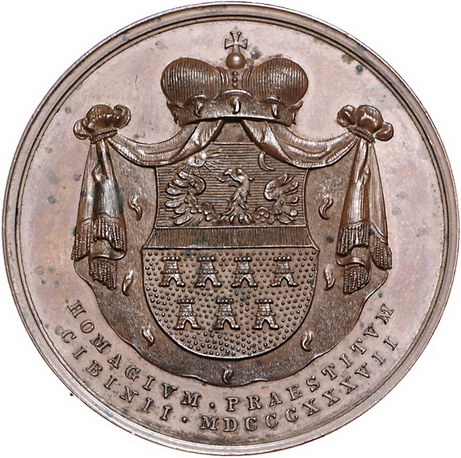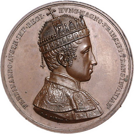 Los-Nummer: Auktion 51 - 2209 Haus Habsburg Haus Habsburg Ferdinand I. 1835-1848, Bronzemedaille 1837, von Boehm. Auf die Huldigung Siebenbürgens in Hermannstadt. Brustbild im Krönungsornat mit Stephanskrone nach rechts / Wappen auf gekröntem Wappenmantel. Slg. Montenuovo 2568, Wurzbach 2027. 46,5 mm. Winz. Flecke, vorzüglich - Stempelglanz Schätzpreis: 90,- Zuschlag: 180,- |
