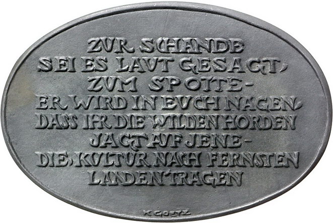 Los-Nummer: Auktion 51 - 2356 Medaillen Münchner Medailleure Goetz, Karl Ovale Zinkgussmedaille 1914. Wie vorher. Kienast 140. 90 x 60 mm. Vorzüglich - prägefrisch Schätzpreis: 200,- Zuschlag: 200,- |