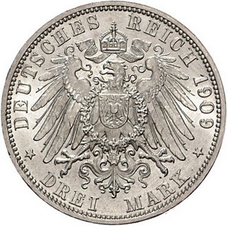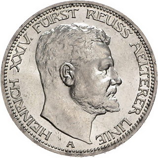 Los-Nummer: Auktion 51 - 2665 Münzen des Deutschen Kaiserreichs Reuss, ältere Linie Heinrich XXIV. 1902-1918, 3 Mark 1909 A. Jaeger 119. Fast Stempelglanz Schätzpreis: 400,- Zuschlag: unverkauft |