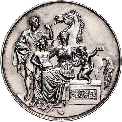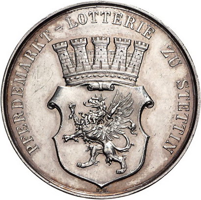 Los-Nummer: Auktion 51 - 1415 Altdeutsche Münzen und Medaillen Pommern-Stettin, Stadt Medaille o.J., von Weigand und Kullrich. Auf die Pferde-Lotterie zu Stettin. Sitzende Frau mit verbundenen Augen, daneben zwei Kinder, im Hintergrund Mann mit Pferd / Gekrönter Greifenschild. Slg. Marienburg 6375, Sommer K 170 / W 124. 42 mm, 28,89 g. Winz. Randfehler, vorzüglich + Schätzpreis: 90,- Zuschlag: unverkauft |