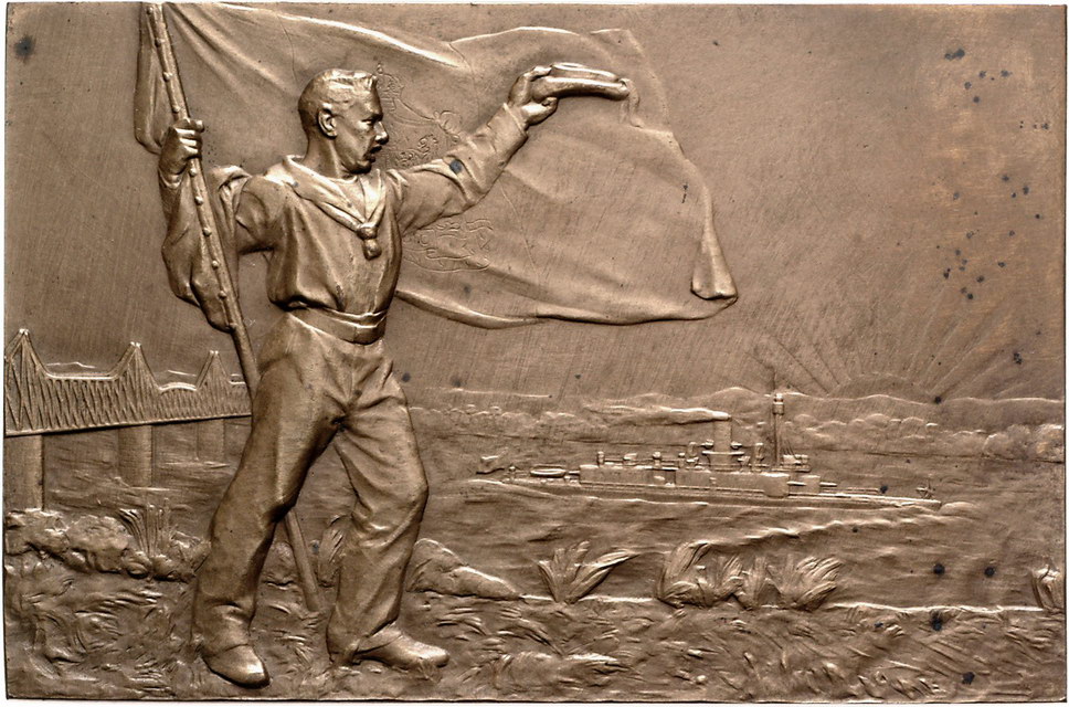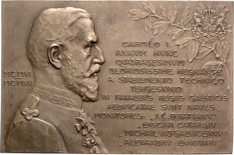 Los-Nummer: Auktion 51 - 3669 Ausländische Münzen und Medaillen Rumänien Carol I. 1866-1914, Bronzeplakette#0Medaille# 1907 von Schaefer. Auf sein 40jähriges Regierungsjubiläum und den Bau von vier Schiffen auf der Schiffswerft in Galatz durch das 'Stabilimento tecnico' in Triest. Brustbild in Uniform neben Schrift / Flusslandschaft mit Dampfschiff vor aufgehender Sonne, im Vordergrund schwenkt Matrose mit Fahne einen Hut. Wurzbach 4371. 99 x 66 mm. Originalschachtel. Vorzüglich Schätzpreis: 300,- Zuschlag: unverkauft |