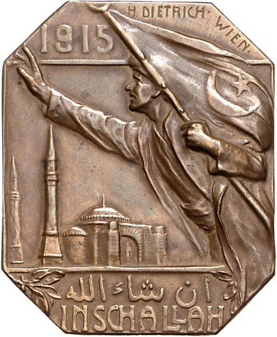 Los-Nummer: Auktion 51 - 4061 Ausländische Münzen und Medaillen Türkei Mehmet V. (AH -) 1909-1918, Einseitige Bronzeplakette#0Medaille# 1915, von Dietrich. Abzeichen des Roten Halbmonds. Türkischer Soldat mit Fahne, links die Moschee Hagia Sofia, darunter in türkischer und deutscher Schrift: INSCHALLAH (so Gott will). Wurzbach 8869. 48,5 x 39,5 mm. Vorzüglich Schätzpreis: 200,- Zuschlag: 185,- |