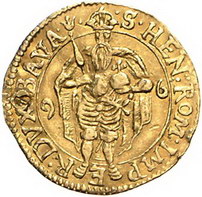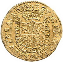 Los-Nummer: Auktion 51 - 97 Altdeutsche Münzen und Medaillen Bayern Wilhelm V. 1579-1598, Dukat 1596, München. Zur Einweihung der Michaelskirche in München. St. Heinrich steht im Mantel von vorn mit Schwert und Reichsapfel zwischen geteilter Jahreszahl / Gekröntes mit Ordenskette behangenes vierfeldiges Wappen. Hahn 56, Wittelsbach 576, Friedberg 186. GOLD. Gestopftes Loch, sehr schön Schätzpreis: 750,- Zuschlag: 700,- |