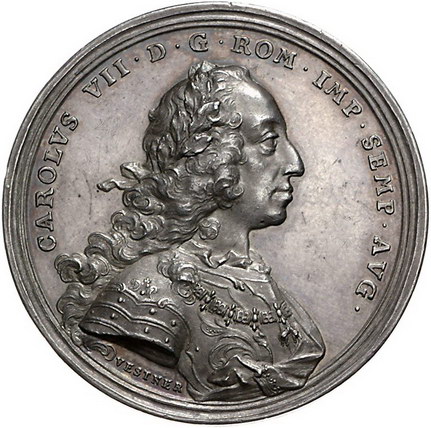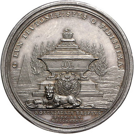 Los-Nummer: Auktion 51 - 105 Altdeutsche Münzen und Medaillen Bayern Karl Albert 1726-1745, Medaille 1745, von Vestner. Auf seinen Tod. Brustbild nach rechts / Grabmal in Landschaft, davor Wappen und Löwe. Wittelsbach 1911, Slg. Montenuovo 1667 , Slg. Julius 1542, Hauser 71, Bernheimer 340. 44 mm, 29,42 g. Schöne Patina. Vorzüglich - Stempelglanz Schätzpreis: 500,- Zuschlag: 500,- |