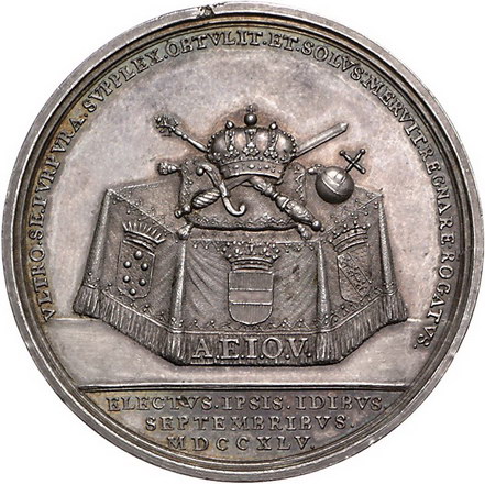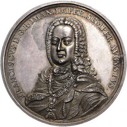 Los-Nummer: Auktion 51 - 799 Altdeutsche Münzen und Medaillen Frankfurt, Stadt Medaille 1745, von van Swinderen. Auf die Kaiserwahl Franz' I. Geharnischtes Brustbild mit großer Allongeperücke und im Mantel mit Vlieskette halblinks / Auf sechseckigem Tisch Krönungsinsignien auf einem Kissen. J.u.F. 768, Förschner 310 , Slg. Julius 1597. 45 mm, 38,70 g. Schöne Patina. Kl. Schrötlingsfehler, kl. Patinafleck, vorzüglich + Schätzpreis: 600,- Zuschlag: 950,- |