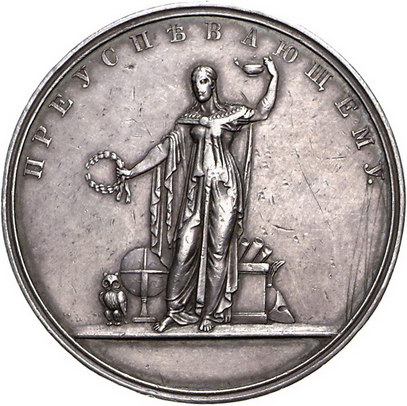 Los-Nummer: Auktion 51 - 3811 Ausländische Münzen und Medaillen Russland Nikolaus I. 1825-1855, Allgemeine Preismedaille o.J., unsigniert, von Sizorsky und Baranov? Gekrönter Doppeladler / Stehende Minerva vor Gegenständen der Gewerbe. Diakov 523.3. 43 mm, 25,48 g. Fast vorzüglich Schätzpreis: 250,- Zuschlag: 200,- |