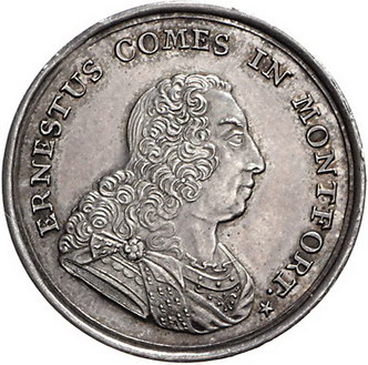 Los-Nummer: Auktion 51 - 1104 Altdeutsche Münzen und Medaillen Montfort, Grafschaft Ernst 1730-1758, Medaille 1736, Langenargen. Stempel von Anton Haag. Brustbild nach rechts / Wappen mit Inful und Fahne auf Mantel. Ebner 295, Slg. Wurster 1575. 34 mm, 14,11 g. Schöne Patina. Vorzüglich + Schätzpreis: 2000,- Zuschlag: 2100,- |