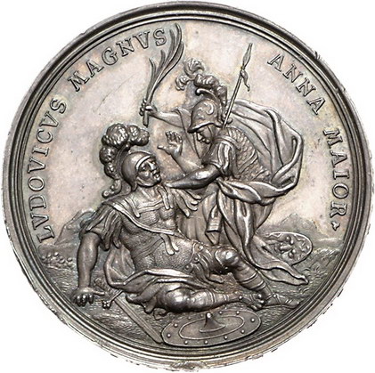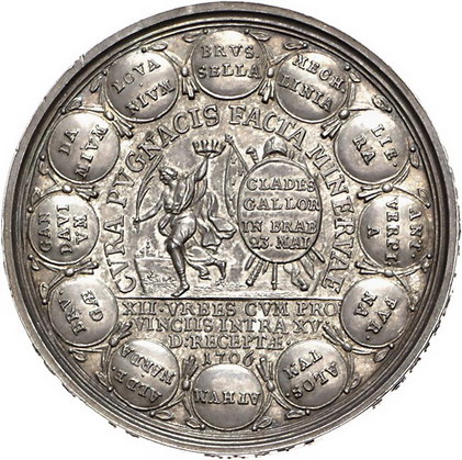 Los-Nummer: Auktion 51 - 2896 Ausländische Münzen und Medaillen Belgien-Brabant Philipp V. von Spanien 1700-1712, Satirische Medaille 1706, von P.H. Müller. Auf die Schlacht von Ramillies und die Niederlage der Franzosen in Brabant. Anna von England als Minerva über dem am Boden liegenden Ludwig XIV. als Mars / Viktoria neben Schild mit Trophäen, umher zwölf Wappen mit Nennung von Städten wie Brüssel, Mechelen, Antwerpen, Alost, Brügge, Gent u.a. Eimer 421, Slg. Fieweger 616, van Loon 5/39, Francs 288/97, Forster -. 43 mm, 29,90 g. Schöne Patina. Vorzüglich + Schätzpreis: 500,- Zuschlag: 850,- |