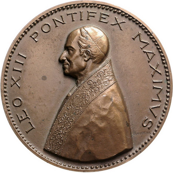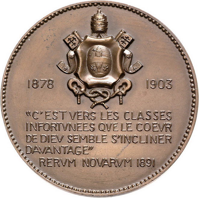 Los-Nummer: Auktion 51 - 3195 Ausländische Münzen und Medaillen Italien-Kirchenstaat Leone XIII. 1878-1903, Bronzemedaille 1903, von Lagriffoul. Auf seinen Tod. Brustbild in Mozetta mit Stola und Calotta nach links / Päpstliches Wappen zwischen Jahreszahlen, darunter fünf Zeilen Schrift. 68 mm. Vorzüglich Schätzpreis: 175,- Zuschlag: unverkauft |