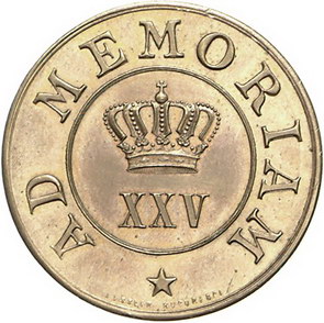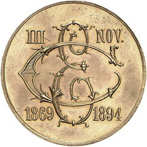 Los-Nummer: Auktion 51 - 3663 Ausländische Münzen und Medaillen Rumänien Carol I. 1866-1914, Vergoldete Bronzemedaille 1894, von Fessler. Auf das 25jährige Ehejubiläum des Königspaares. Die ineinander verschlungenen Monogramme Karls und seiner Gemahlin Elisabeth Ottilie von Wied (Carmen Sylva) / Krone über XXV. 30 mm. Vorzüglich + Schätzpreis: 90,- Zuschlag: unverkauft |