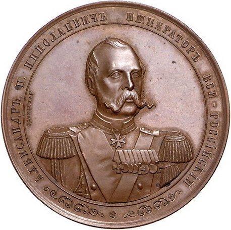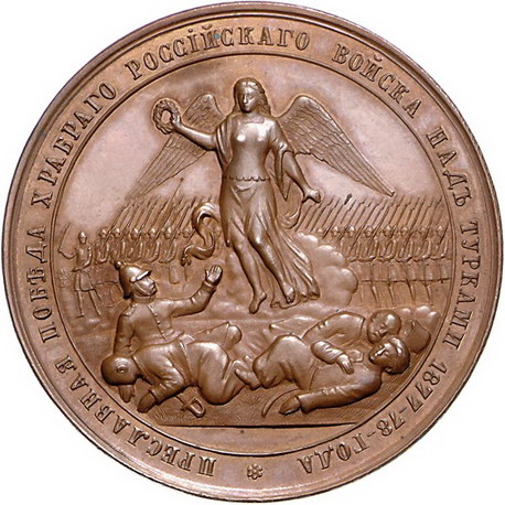 Los-Nummer: Auktion 51 - 3833 Ausländische Münzen und Medaillen Russland Alexander II. 1855-1881, Bronzemedaille 1877, von Drentwett. Auf den Sieg der russischen Armee über die Türken (1877-1878). Brustbild in Uniform halbrechts / Engel mit Lorbeerkranz in der Rechten schwebt über am Boden liegende tote und verwundete Soldaten, im Hintergrund marschierende Truppen. Diakov 844.1. 46,5 mm. Vorzüglich - Stempelglanz Schätzpreis: 200,- Zuschlag: 525,- |