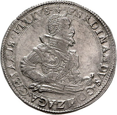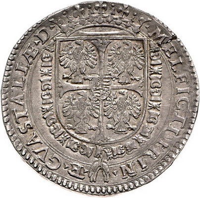 Los-Nummer: Auktion 51 - 3185 Ausländische Münzen und Medaillen Italien-Guastalla Ferrante II. Gonzaga 1575-1630, Tallero o.J. Geharnischtes Brustbild nach rechts / Gekröntes vierfeldiges Wappen mit aufgelegtem Kreuz und Mittelschild umgeben von Ordenskette. CNI 9.102.102/03, Davenport 3905, Varesi 369 (R3). Äußerst selten. Winz. Schrötlingsfehler, fast vorzüglich Schätzpreis: 20000,- Zuschlag: 27000,- |