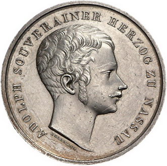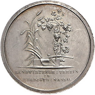 Los-Nummer: Auktion 51 - 1253 Altdeutsche Münzen und Medaillen Nassau Adolph 1839-1866, Silberne Verdienstmedaille o.J., von Zollmann. Büste nach rechts / Landwirtschaftliche Geräte vor einem mit Blumen und Kornähren bewachsenem Gedenkstein. Isenbeck 231 b , Klenau 1297. 33,4 mm, 16,35 g. Vorzüglich Schätzpreis: 175,- Zuschlag: 175,- |