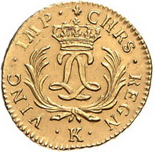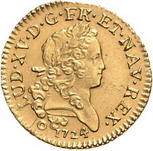 Los-Nummer: Auktion 51 - 3000 Ausländische Münzen und Medaillen Frankreich Ludwig XV. 1715-1774, Louis d'or Mirliton 1724 K, Bordeaux. Grandes palmes. Gadoury 339, Duplessy 1638, Friedberg 459. GOLD. Fast vorzüglich Schätzpreis: 1000,- Zuschlag: 950,- |