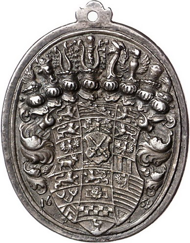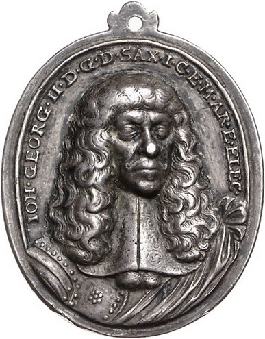 Los-Nummer: Auktion 51 - 1567 Altdeutsche Münzen und Medaillen Sachsen-Albertinische Linie Johann Georg II. 1656-1680, Ovale Medaille 1669, von Balthasar Lauch, Leipzig. Auf den Empfang des Hosenbandordens. Brustbild von vorn mit Allongeperücke / Achtfach behelmtes Wappen. Slg. Merseburger 1180 (120 Mark) , Tentzel Taf. 57/2, Slg. Engelhardt 950. 39 x 42 mm, 28,92 g. Originalguss. Originalöse. Vorderseite minimal überarbeitet, sehr schön Schätzpreis: 750,- Zuschlag: 600,- |