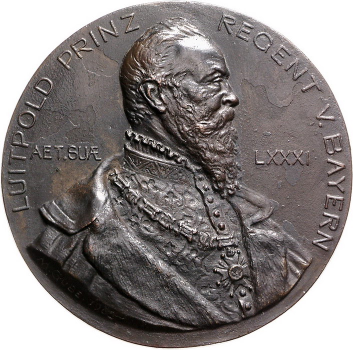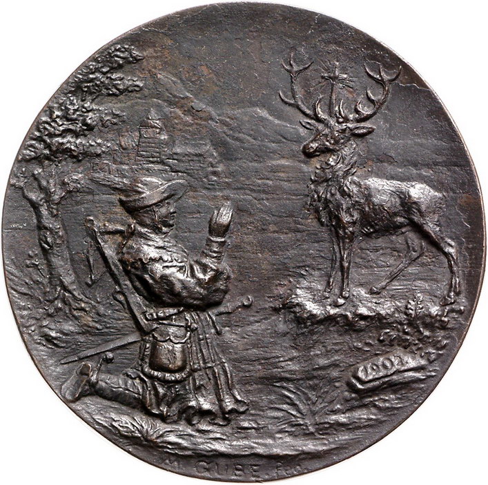 Los-Nummer: Auktion 51 - 144 Altdeutsche Münzen und Medaillen Bayern Prinzregent Luitpold 1886-1913, Große Bronzegussmedaille 1902, von Max Gube. Auf seinen 81. Geburtstag. Brustbild mit Mantel und umgelegter Ordenskette nach rechts / In Gebirgslandschaft kniet St. Hubertus vor dem Hirsch. Hauser 180 , Slg. Benzino 1484. 101 mm. Vorzüglich Schätzpreis: 200,- Zuschlag: unverkauft |