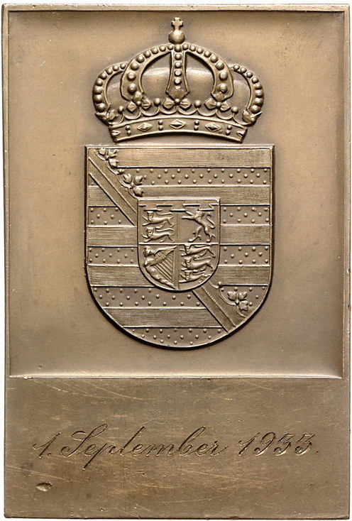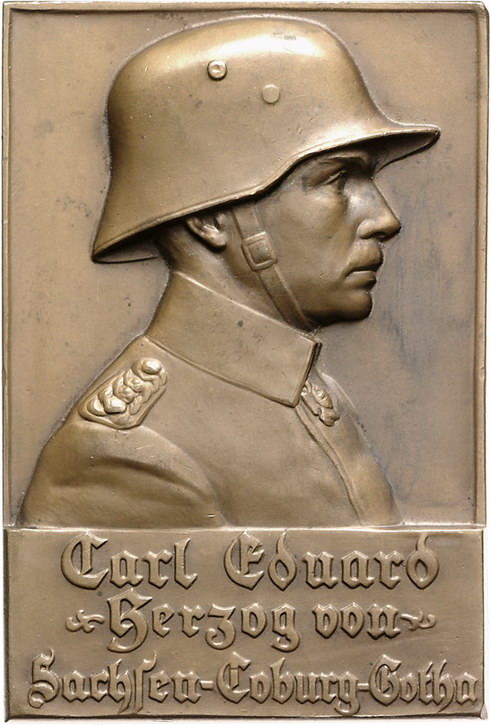 Los-Nummer: Auktion 51 - 1675 Altdeutsche Münzen und Medaillen Sachsen-Coburg-Gotha Carl Eduard 1905-1918, Bronzene Ehrenplakette#0Medaille# o.J., graviert 1932. Brustbild in Wehrmachtsuniform mit Stahlhelm nach rechts, darunter drei Zeilen Schrift / Gekröntes sächsisches Wappen mit aufgelegtem Wappenschild von Großbritannien, unten Gravur. 74,5 x 50 mm. Kl. Kratzer, vorzüglich Schätzpreis: 125,- Zuschlag: 120,- |