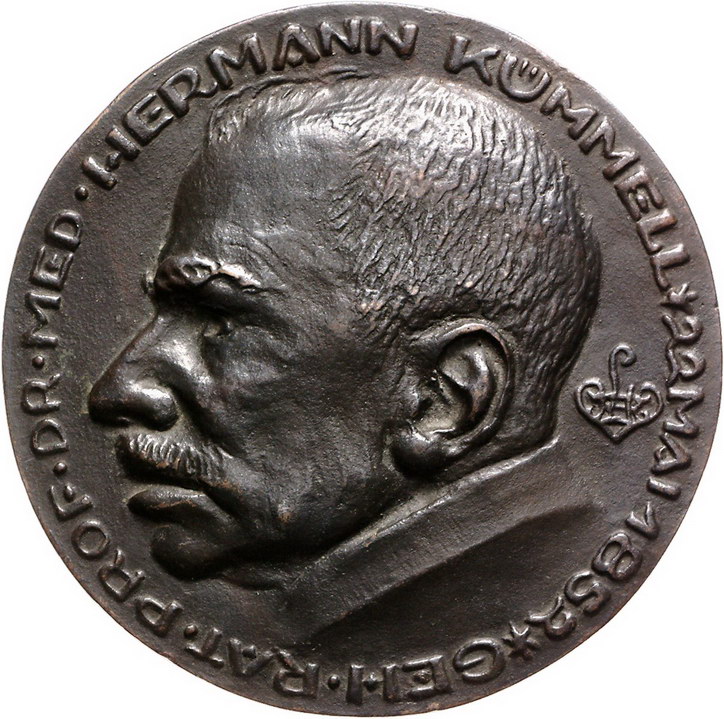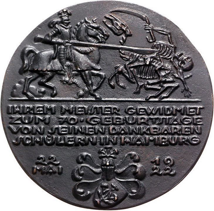 Los-Nummer: Auktion 51 - 1856 Altdeutsche Münzen und Medaillen Waldeck-Korbach, Stadt Bronzegussmedaille 1922, von Luksch. Auf den 70. Geburtstag von Hermann Kümmell. Widmung seiner Schüler und Studenten. Büste nach links / Ritter im Kampf gegen den Tod, darunter vier Zeilen Schrift über behelmtem Wappen zwischen Datum. Kat. Hamburger Kunsthalle 1062, Norddeutsches Jahrbuch 1979, 56/58. 103,5 mm. Gussfrisch Schätzpreis: 200,- Zuschlag: 260,- |