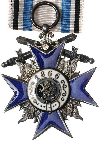 Los-Nummer: Auktion 51 - 146 Altdeutsche Münzen und Medaillen Bayern Prinzregent Luitpold 1886-1913, Militär Verdienstorden#0Medaille#. 4. Klasse mit Schwertern, Silber. Blau emailliertes Kreuz, in den Winkeln Flammen. Löwe nach links auf schwarzem Grund / Gekröntes Monogramm auf schwarzem Grund. Gestiftet 1866, verliehen 1905-1918. Nimmergut 482, OEK 410, Klenau 327. 49 x 41 mm. Weißes Band mit blau-schwarzen Streifen. Originaletui. Vorzüglich Schätzpreis: 300,- Zuschlag: 290,- |