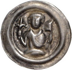 Los-Nummer: Auktion 51 - 196 Altdeutsche Münzen und Medaillen Brandenburg-Preußen Albrecht der Bär 1134-1157, Brakteat, Wegeleben, Ballenstedt oder Aschersleben. 0,87 g. Markgraf mit Lilienstab und Fahne über Torbogen. Bahrfeldt 23, Thormann 11, Slg. Bonhoff -, Berger 1749. Sehr schön Schätzpreis: 750,- Zuschlag: 650,- |