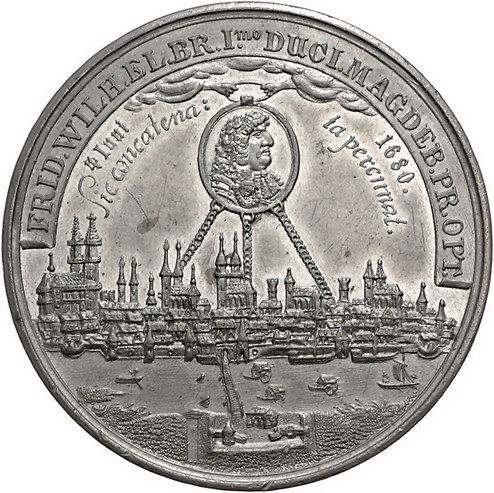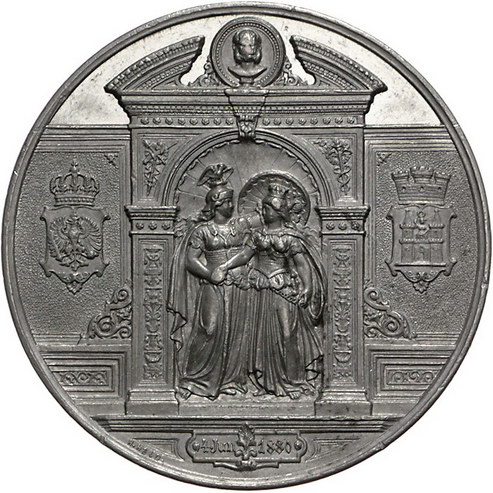 Los-Nummer: Auktion 51 - 570 Altdeutsche Münzen und Medaillen Brandenburg-Preußen Wilhelm I. 1861-1888, Zinnmedaille 1880, von Held. Auf die 200jährige Zugehörigkeit Magdeburgs zu Preußen. Borussia und Stadtgöttin unter Torbogen / Brustbild des Großen Kurfürsten im Medaillon über Stadtansicht. Slg. Marienburg 6173 (Br.). 50,5 mm, 55,80 g. Vorzüglich Schätzpreis: 100,- Zuschlag: 135,- |