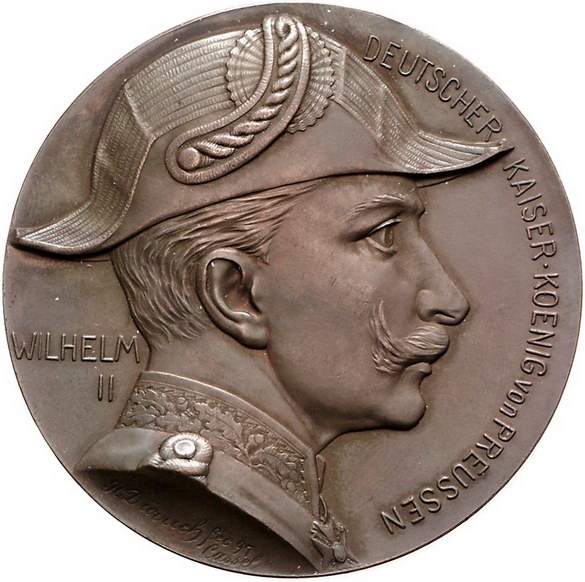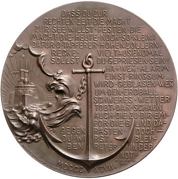 Los-Nummer: Auktion 51 - 580 Altdeutsche Münzen und Medaillen Brandenburg-Preußen Wilhelm II. 1888-1918, Bronzemedaille 1897, von Dürrich. Auf den Ausbau der deutschen Flotte. Brustbild mit Admiralshut / Zwanzig Zeilen Schrift neben Anker und Kriegsschiff. Slg. Marienburg 7112. 60 mm. Vorzüglich Schätzpreis: 125,- Zuschlag: 100,- |