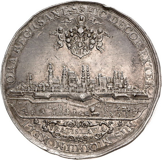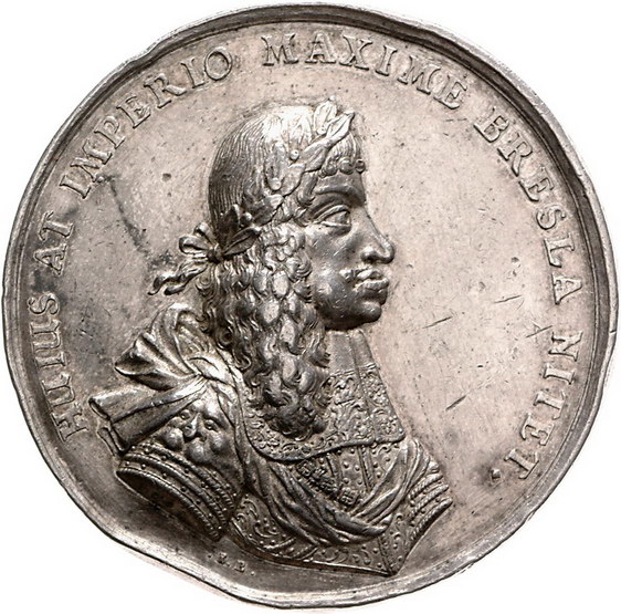 Los-Nummer: Auktion 51 - 1734 Altdeutsche Münzen und Medaillen Schlesien-Breslau, Stadt Medaille 1669, von Buchheim. Auf die Huldigung Breslaus. Belorbeertes und geharnischtes Brustbild Kaiser Leopolds nach rechts / Stadtansicht von Breslau, darüber zwei Engel mit Stadtwappen. Fr.u.S. 4101 , Slg. Julius 109, Slg. Montenuovo -. 58 mm, 61,98 g. Mehrere stärkere Randfehler, sehr schön Schätzpreis: 150,- Zuschlag: 215,- |