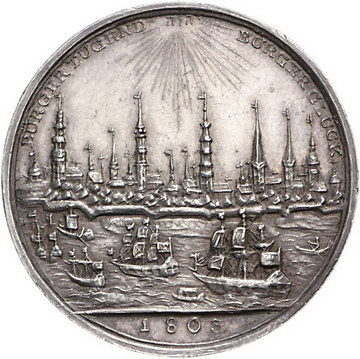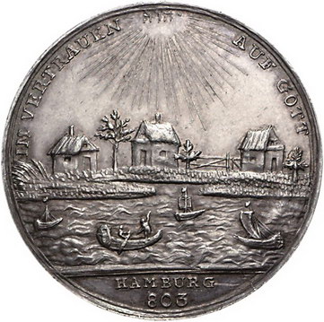 Los-Nummer: Auktion 51 - 881 Altdeutsche Münzen und Medaillen Hamburg-Stadt Medaille 1803. Auf die 1000-Jahrfeier der Stadtgründung. IM VERTRAUEN AUF GOTT Drei Hütten am Elbufer mit Fischerbooten / BÜRGERTUGEND - BÜRGERGLÜCK Unter strahlendem Auge Gottes Stadtansicht von der Elbe aus mit Segelschiffen. Gaedechens 2001. 37 mm, 13,58 g. Vorzüglich Schätzpreis: 125,- Zuschlag: 170,- |