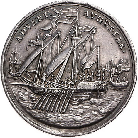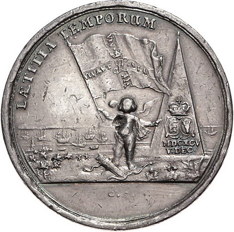 Los-Nummer: Auktion 51 - 1076 Altdeutsche Münzen und Medaillen Mecklenburg-Güstrow Gustav Adolf 1636-1695, Medaille o.J. (1696), von Chr. Schneider. Auf die Ankunft seiner Tochter Luise in Dänemark am 5. Dezember 1695. Rudergaleere, im Hintergrund weitere Schiffe / Am Strand stehender Cupido schwenkt Fahne neben Pyramide, im Hintergrund Schiffe auf Meer. Slg. Gaettens 777 (Zinn) , Galster 140. 48,5 mm, 43,91 g. Sehr selten. Kl. Randfehler, sehr schön Schätzpreis: 750,- Zuschlag: 1700,- |