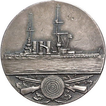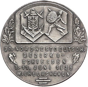 Los-Nummer: Auktion 51 - 1337 Altdeutsche Münzen und Medaillen Oldenburg-Wilhelmshaven, Stadt Medaille 1925. Auf das 37. Nordwestdeutsche Bezirksschießen. Schiff / Wappen über fünf Zeilen Schrift. 35 mm. Sehr schön - vorzüglich Schätzpreis: 75,- Zuschlag: 100,- |
