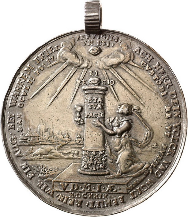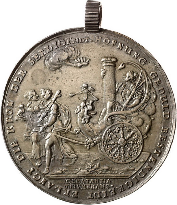 Los-Nummer: Auktion 51 - 1556 Altdeutsche Münzen und Medaillen Sachsen-Albertinische Linie Johann Georg I. 1615-1656, Medaille 1629, von Dadler. Auf den Leipziger Theologenkongress. Die Beständigkeit in Triumphwagen, der von Hoffnung und Geduld gezogen wird / Religion neben Friedenssäule, im Hintergrund Stadtansicht von Dresden. Tentzel, Seite 471-475, Erbstein 804, Maué 15, Wiecek 46. 63,5 mm, 50,96 g (mit Henkel). An altem Henkel. Vergoldet, schön - sehr schön Schätzpreis: 150,- Zuschlag: 170,- |