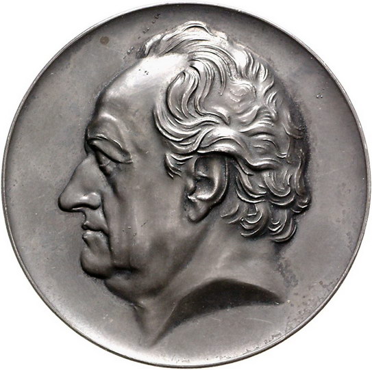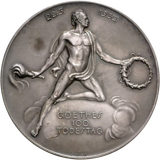 Los-Nummer: Auktion 51 - 1614 Altdeutsche Münzen und Medaillen Sachsen-Dresden, Stadt Medaillen von Friedrich Wilhelm Hörnlein, Medaille 1932. Auf den 100. Todestag Johann Wolfgang von Goethes. Büste nach links / Genius mit Fackel und Kranz auf umwölkter Kugel. Arnold 256 , Förschner. 56 mm, 49,15 g. Mattiert. Vorzüglich Schätzpreis: 200,- Zuschlag: 360,- |