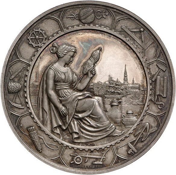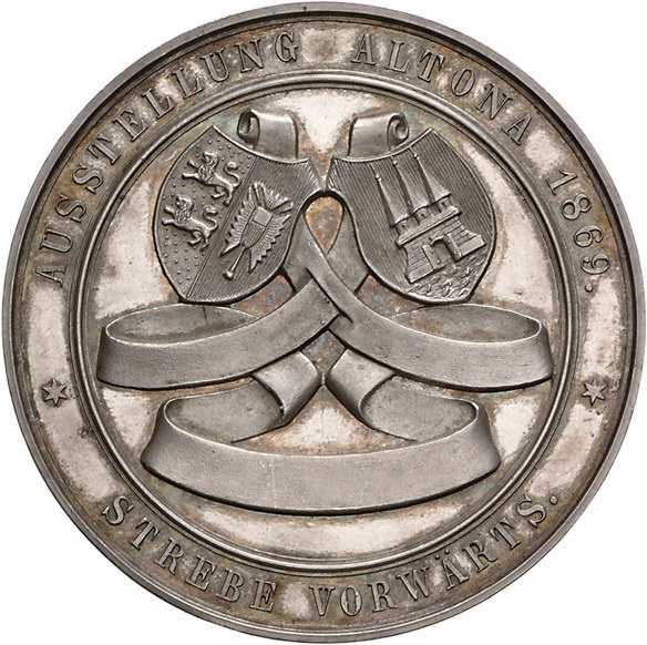 Los-Nummer: Auktion 51 - 1768 Altdeutsche Münzen und Medaillen Schleswig-Altona, Stadt Medaille 1869, von Claudius. Prämie zur Gewerbeausstellung. Sitzende Frau vor Stadtansicht. Wappen von Schleswig-Holstein und Altona. Lange 1243. 60 mm, 95,00 g. Vorzüglich Schätzpreis: 125,- Zuschlag: 250,- |