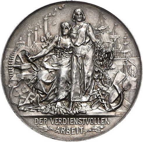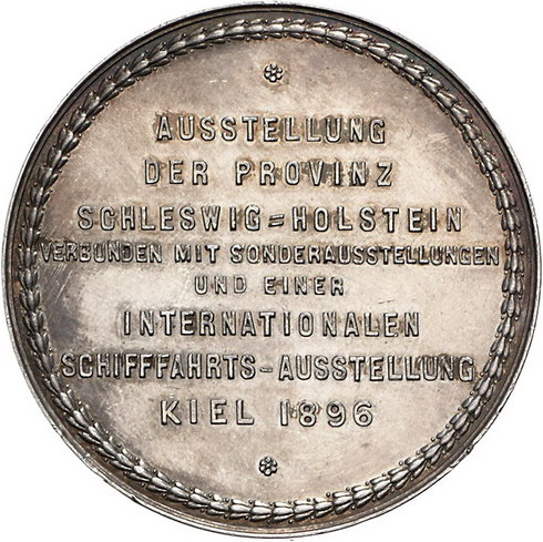 Los-Nummer: Auktion 51 - 1770 Altdeutsche Münzen und Medaillen Schleswig-Kiel, Stadt Medaille 1896, signiert J.v.L. Auf die Ausstellung der Provinz Schleswig-Holstein und die Internationale Schifffahrts-Ausstellung. Sitzende und stehende weibliche Person zwischen Attributen des Handwerks und der Schifffahrt vor Segelschiff und Schornsteinen / Acht Zeilen Schrift in Lorbeerkranz. Lange 1347 b. Auflage: 109 Stück. 50,5 mm, 34,86 g. Kl. Randfehler, sehr schön - vorzüglich Schätzpreis: 125,- Zuschlag: 120,- |