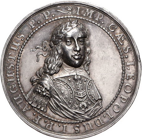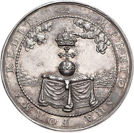Los-Nummer: Auktion 51 - 2087 Haus Habsburg Haus Habsburg Leopold I. 1657-1705, Medaille 1658, von Buchheim. Auf die Kaiserkrönung in Frankfurt. Brustbild halbrechts / Hand aus Wolke hält Krone über Reichsapfel auf einem Tisch. J.u.F. 1896, Förschner 102, Slg. Julius 100. 47 mm, 28,53 g. Vorzüglich Schätzpreis: 900,- Zuschlag: 1100,- |