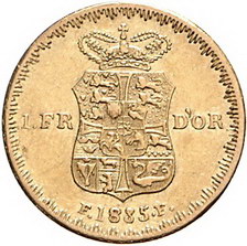 Los-Nummer: Auktion 51 - 2962 Ausländische Münzen und Medaillen Dänemark Frederik VI. 1808-1839, Frederik d'or 1835. Hede 4 B, Friedberg 287. GOLD. Sehr schön - vorzüglich Schätzpreis: 500,- Zuschlag: 1250,- |