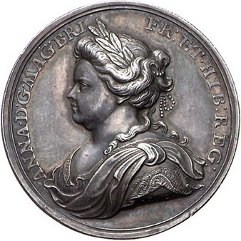 Los-Nummer: Auktion 51 - 3097 Ausländische Münzen und Medaillen Großbritannien Anne 1702-1714, Medaille 1713, von Croker. Auf den Frieden von Utrecht. Brustbild nach links / Stehende Britannia vor Schiffen. Eimer 460, Med. Illustrations Tf. 135/11-12. 35 mm, 16,18 g. Sehr schön - vorzüglich Schätzpreis: 100,- Zuschlag: 110,- |