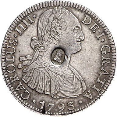 Los-Nummer: Auktion 51 - 3103 Ausländische Münzen und Medaillen Großbritannien George III. 1760-1820, #3Mexiko#. Karl IV. 8 Reales 1793 mit ovalem Gegenstempel {(Königsbrustbild)}. Seaby 3765 A. Kl. Randfehler, sehr schön + Schätzpreis: 300,- Zuschlag: 325,- |