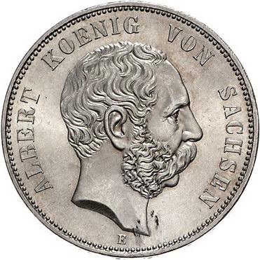 Los-Nummer: Auktion 51 - 2672 Münzen des Deutschen Kaiserreichs Sachsen Albert 1873-1902, 5 Mark 1875 E. Jaeger 122. Kl. Schrötlingsfehler auf der Vorderseite, fast Stempelglanz Schätzpreis: 1250,- Zuschlag: unverkauft |
