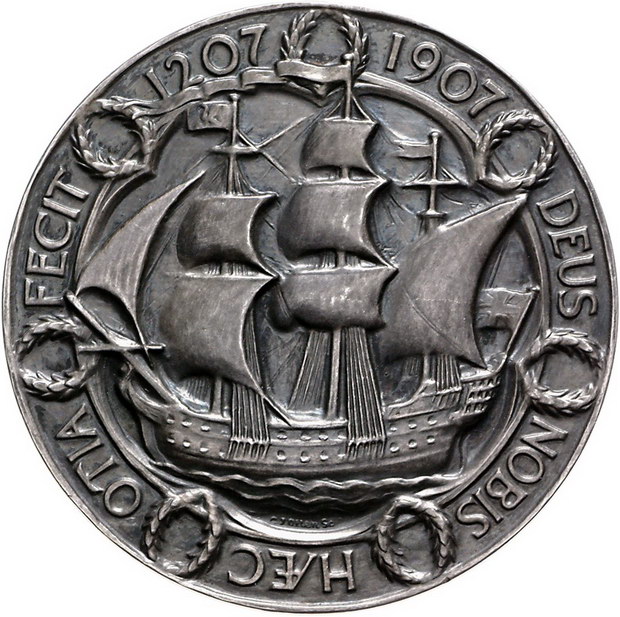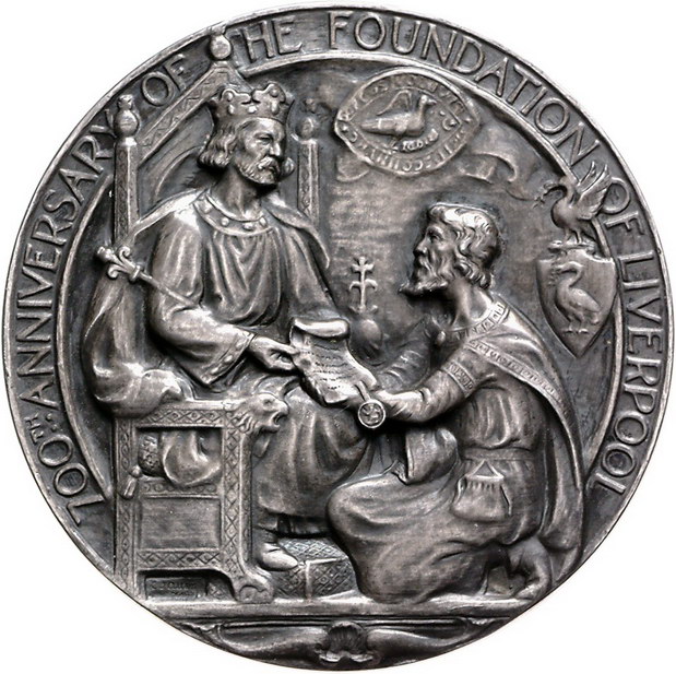 Los-Nummer: Auktion 51 - 3121 Ausländische Münzen und Medaillen Großbritannien Edward VII. 1901-1910, Medaille o.J. (1907), von Allen. Kniender Liverpooler Bürger vor thronendem König John / Schiff. Eimer 1898. 63,5 mm, 116,05 g Vorzüglich Schätzpreis: 100,- Zuschlag: 110,- |