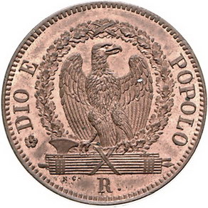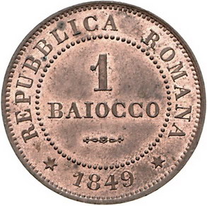 Los-Nummer: Auktion 51 - 3233 Ausländische Münzen und Medaillen Italien-Römische Republik Cu Baiocchi 1849, Rom. CNI 9, Pagani 344. Prachtexemplar. Fast Stempelglanz Schätzpreis: 500,- Zuschlag: unverkauft |