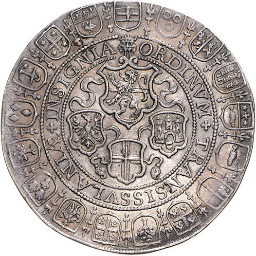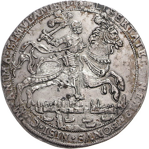 Los-Nummer: Auktion 51 - 3442 Ausländische Münzen und Medaillen Niederlande Medaille o.J. (1597). Auf die Schlacht von Turnhout. Statthalter Moritz von Nassau-Oranien zu Pferd nach rechts, unten Stadtansicht von Campen / Wappen von Overijsel, Deventer, Campen und Zwolle, außen herum die 17 Wappen des Städtebundes. Van Loon I, Seite 494. 54 mm, 41,47 g. Bearbeiteter Rand, sehr schön Schätzpreis: 250,- Zuschlag: 525,- |
