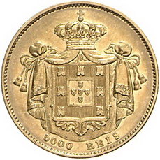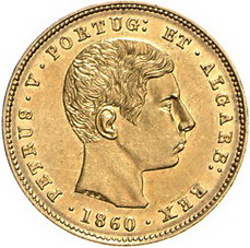 Los-Nummer: Auktion 51 - 3652 Ausländische Münzen und Medaillen Portugal Pedro V. 1853-1861, 5000 Reis 1860. Friedberg 147. GOLD. Sehr schön - vorzüglich Schätzpreis: 300,- Zuschlag: 316,- |