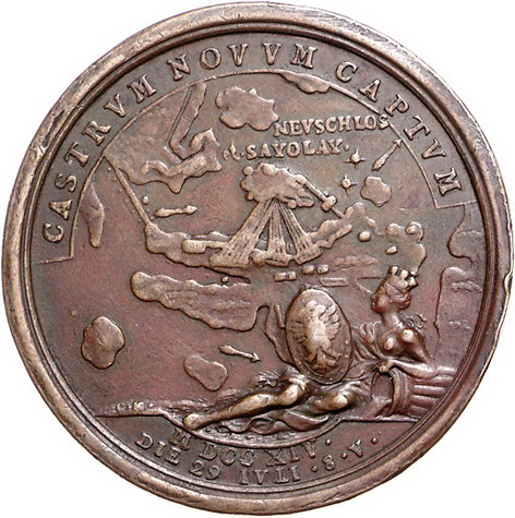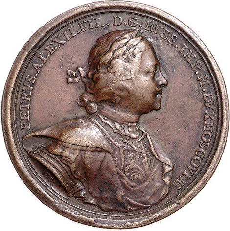 Los-Nummer: Auktion 51 - 3688 Ausländische Münzen und Medaillen Russland Peter der Große 1689-1725, Bronzemedaille 1714, von Iwanoff. Auf die Einnahme von Neuschloß. Brustbild nach rechts / Darstellung der unter Beschuss liegenden Halbinsel mit Befestigungsanlagen, davor liegende Stadtgöttin. Diakov 48.6. 48,5 mm. Kl. Randfehler, sehr schön Schätzpreis: 150,- Zuschlag: 550,- |