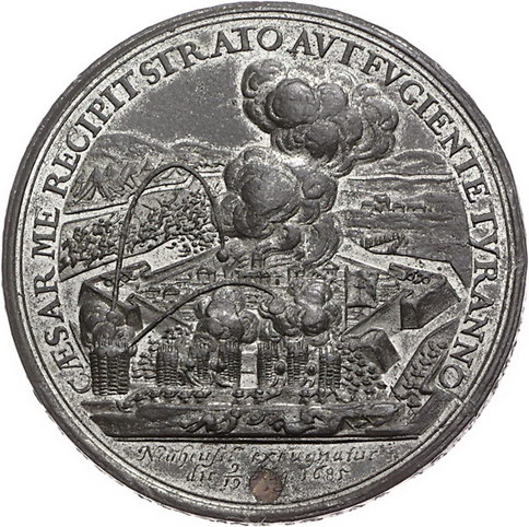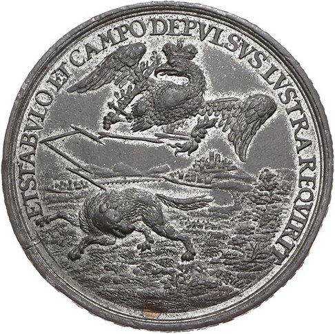 Los-Nummer: Auktion 51 - 2101 Haus Habsburg Haus Habsburg Leopold I. 1657-1705, Zinnmedaille 1685. Auf den Sieg bei Gran und die Einnahme von Neuhäusel. Die Schlacht vor der Festung Gran / Adler vertreibt türkischen Wolf. Slg. Montenuovo 950 , Slg. Julius -. 50 mm. Mit Kupferstift. Sehr schön - vorzüglich Schätzpreis: 75,- Zuschlag: 160,- |