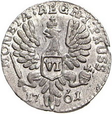 Los-Nummer: Auktion 51 - 3715 Ausländische Münzen und Medaillen Russland Elisabeth I. Petrowna 1741-1761, 6 Gröscher 1761, Königsberg. Russische Besetzung. Diakov 2.3, Olding 454 a. Kl. Randfehler, sehr schön - vorzüglich Schätzpreis: 200,- Zuschlag: 220,- |